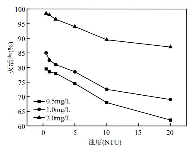 結(jié)果表明,隨著臭氧投量和作用時(shí)間的延長(zhǎng),藻滅活率明顯增加。當(dāng)渾濁度 0.5~20NTU,溫度 5~35 , ℃ pH 值 6.0~9.0,同時(shí)濁度越低,滅活效果越好;隨溫度上升,臭氧滅活銅綠微囊藻能力減弱;堿性較酸性條件下臭氧殺滅銅綠微囊藻的能力更強(qiáng)。藻樣初始濃度對(duì)殺藻效果影響較大,細(xì)胞密度增大,殺藻效果急劇下降。當(dāng)初始藻細(xì)胞密度為 1.0×107cells/L,臭氧投量為2.0mg/L,作用時(shí)間 40min 以上時(shí),在飲用水消毒的濁度、溫度、pH 值范圍內(nèi),銅綠微囊藻的滅活率在 99.0%以上,繁殖能力降低到 0。