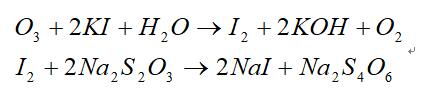 方法原理:一般采用化學碘量法。利用臭氧與碘化鉀的氧化還原反應,置換出與臭氧等當量的碘。再用硫代硫酸鈉與碘作用,以淀粉為指示劑,待完全反應生成無色碘化鈉。根據硫代硫酸鈉的消耗量計算出臭氧濃度。其化學反應方程式如下: