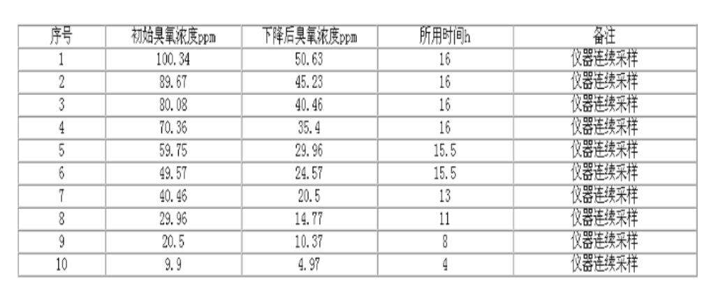 比利時臭氧專家W·J·馬舍蘭在《臭氧雨水的接觸和接觸器尾氣處理》文中認為:臭氧在霧中的半衰期約為4~5h。國內外一些臭氧資料中的半衰期相距很大。為此,我們用一容積為0.95mg/m3的玻璃柜,在環(huán)境溫度為20~25℃;環(huán)境溫度為60~80%Rh,臭氧濃度在200ppm以下的情況下做了一些實驗,現(xiàn)將結果抄錄如下。