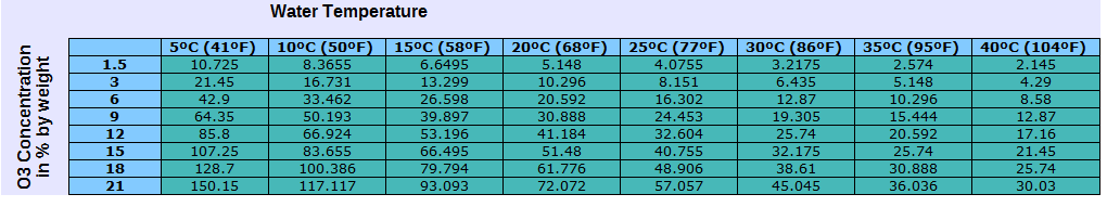 下表根據(jù)水溫和臭氧濃度(以重量%表示)顯示了臭氧在水中的溶解度。