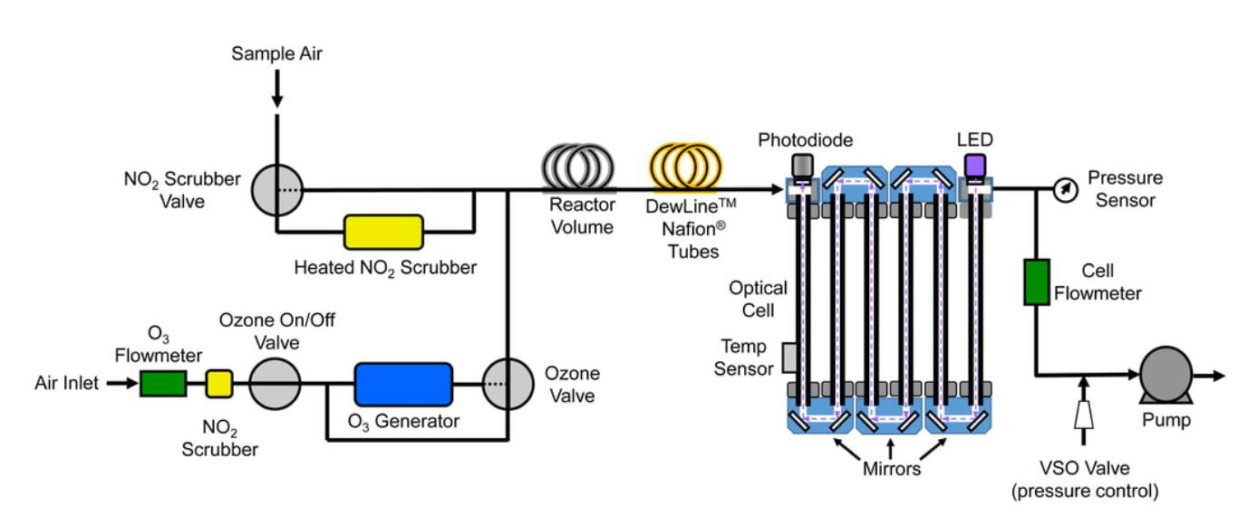 下圖是 美國2B 405 nm NO x 型監(jiān)視器的簡化示意圖。樣品空氣由氣泵以~1.5 L/min的流速連續(xù)吸入儀器。洗滌器閥交替旁路并通過 NO 2 洗滌器發(fā)送樣品空氣以去除樣品中的所有 NO 2,從而允許在沒有 NO 2 的 (I o) 和存在 (I) 的 NO2 的情況下測量光強(qiáng)度。然后使用比爾-朗伯定律計算 I和 Io 的 NO 2 濃度。