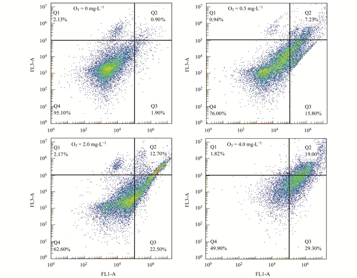 對不同臭氧濃度下BAC上的微生物凋亡特征進行分析, 結果如圖1所示.根據兩種染色劑的熒光強度, 將圖內細胞劃分為第一象限(上右象限, UR)表示晚期凋亡及死亡細胞, 第二象限(上左象限, UL)表示碎片及損傷細胞, 第三象限(下左象限, LL)表示正常細胞, 第四象限(下右象限, LR)為早期凋亡細胞.在無臭氧的條件下, BAC上微生物的存活率為95.10%, 在0.5、2.0和4.0 mg·L-1的臭氧條件下, BAC上微生物的存活率分別降至76.00%、62.60%和49.90%, 這表明臭氧會滅活部分BAC上的微生物, 這可能會減弱BAC的過濾效果.但臭氧濃度為2.0 mg·L-1時, BAC的過濾效果反而提高, 這可能是微生物活性增加強化了生物過濾.